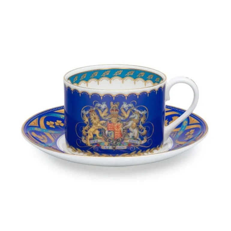 The Design On This Teacup And Saucer Features The Royal Coat Of Arms Supported By A Garland Of Laurel Leaves Representing Peace. Oak Leaves, For Strength, Are Joined By The National Emblems Of The Four Nations Of The United Kingdom – Thistle, Rose, Shamrock And Daffodil Within An Entwined Ribbon That Represents The Supportive Partnership Between The King And Queen.