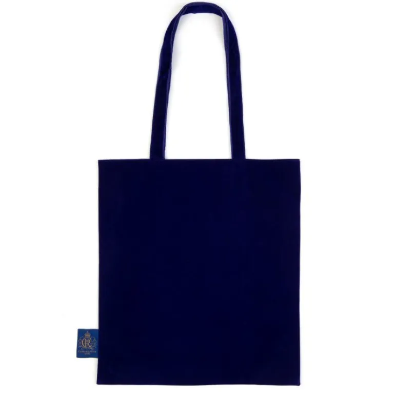 A Deep Purple Velvet Tote Bag With King Charles Iii Cypher Embroidered In Gold Coloured Thread And Surrounded By Flourishes.