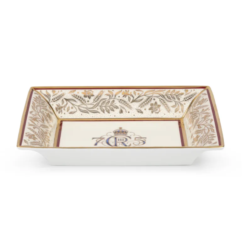 A Limited Edition Of Only 75, This Fine Bone China Desk Tray Is A Unique And Charming Keepsake. At It’S Centre Is A Special Variation Of The King’S Cypher Designed To Mark His Majesty’S 75Th Birthday. Surrounded By Oak Leaves And Wheat Ears Representing Strength And Prosperity, With A Border Of Red And Gold And Hand Finished With 22 Carat Gold Elevates The Whole Piece.
